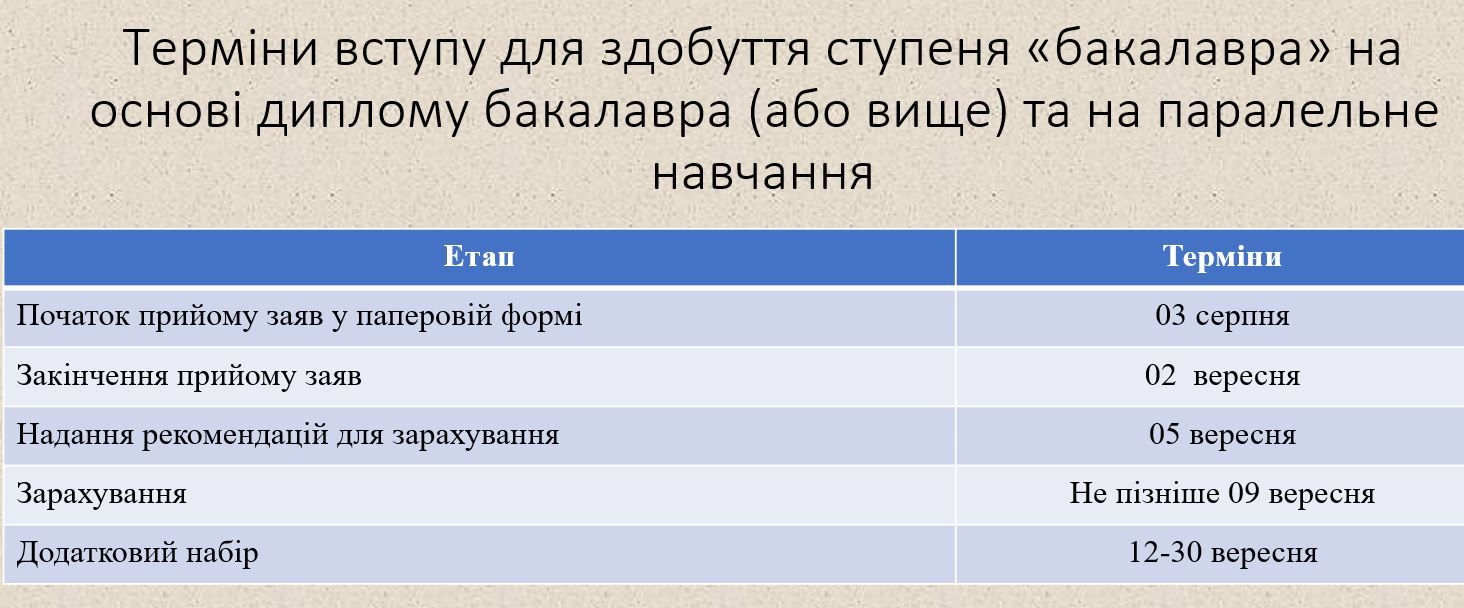 – Бакалавр 26 липня – 25 серпня (вступ на основі такого самого або вищого ступеня (рівня) вищої освіти)