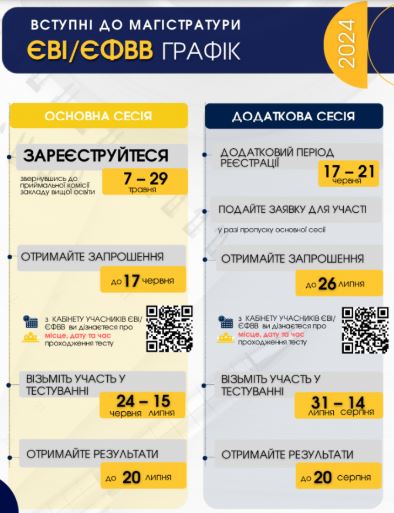В період із 17 червня до 21 червня 2024 року буде можлива реєстрація на додаткову сесію Єдиного вступного іспиту (ЄВІ) та Єдиного фахового вступного випробування (ЄФВВ) для осіб, які не встигли зареєструватися на ці іспити під час основного періоду.
