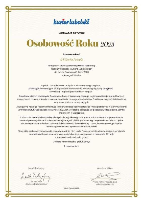 🎉 Вітаємо доктора Вікторію Паєнтко з номінацією на звання Особистість року 2023 у категорії Наука, яку презентує Редакційна колегія Kurier Lubelski ! Це величезна честь, яка підтверджує виняткові досягнення та відданість науці🌟