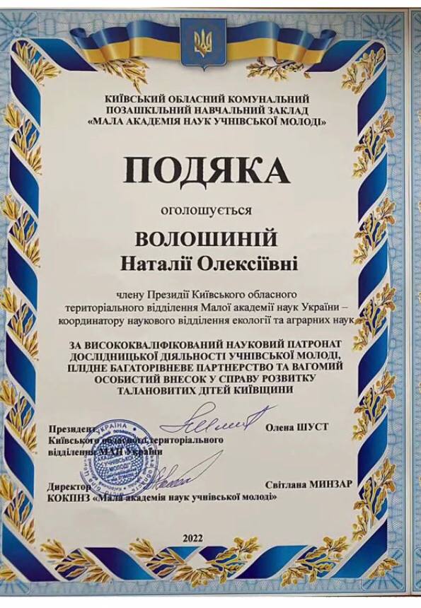 за висококваліфікований науковий патронат дослідницької діяльності учнівської молоді, плідне багаторівневе партнерство та вагомий особистий внесок у справу розвитку талановитих дітей Київщини.